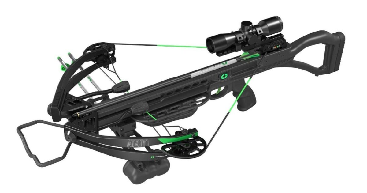 Kit Besta compound “pronto-a-caçar” fabricado pela CROSMAN, da marca CENTERPOINT, modelo AT400, muito rápida (400fps), 190Lbs, vem com Quiver com 3 virotões, Mira Telescópica 4×32 + Montagens weaver e Corda de armar e armador de manivela silencioso.